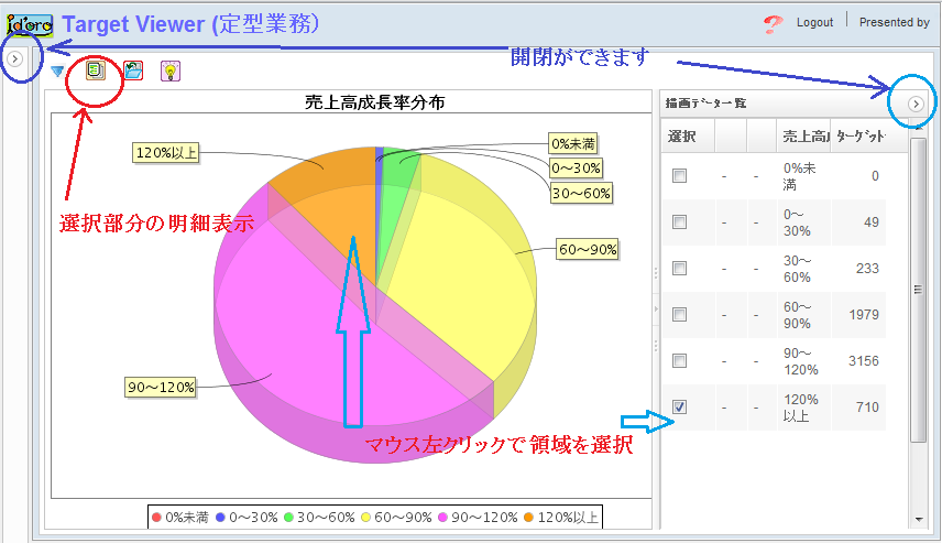 このパイチャートの図の「120%以上」の成長率がある企業を求めるには、その領域をマウス左クリック、